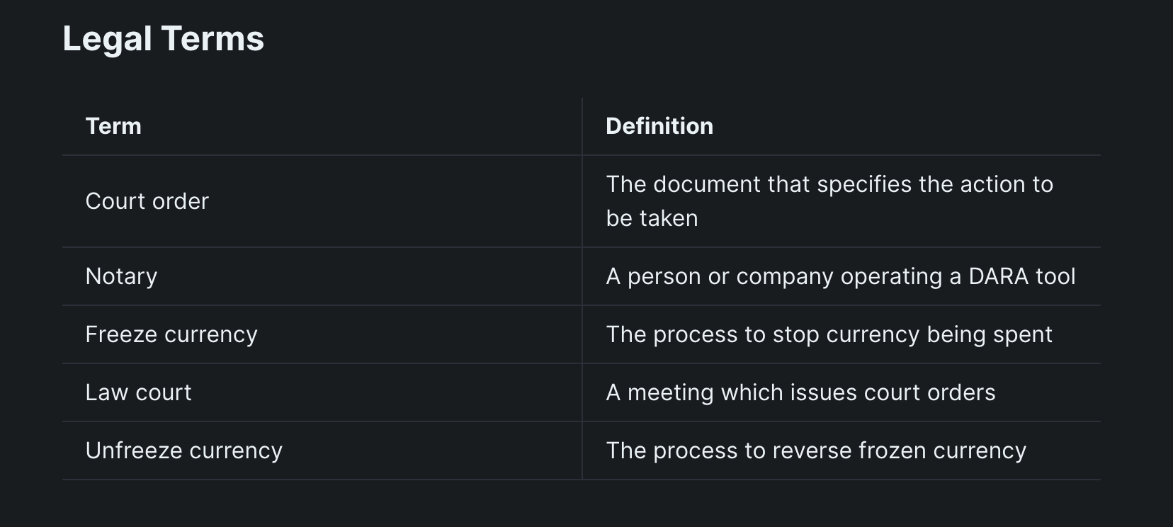 As part of the Blacklist Manager Technical Manual there is a glossary which includes their definition of “Legal Terms” which is, frankly, incredible. This is either terribly sloppy work or is willfully broad, leaving huge grey zones as to what is or is not acceptable to be enforced for freezes or asset reassignments.