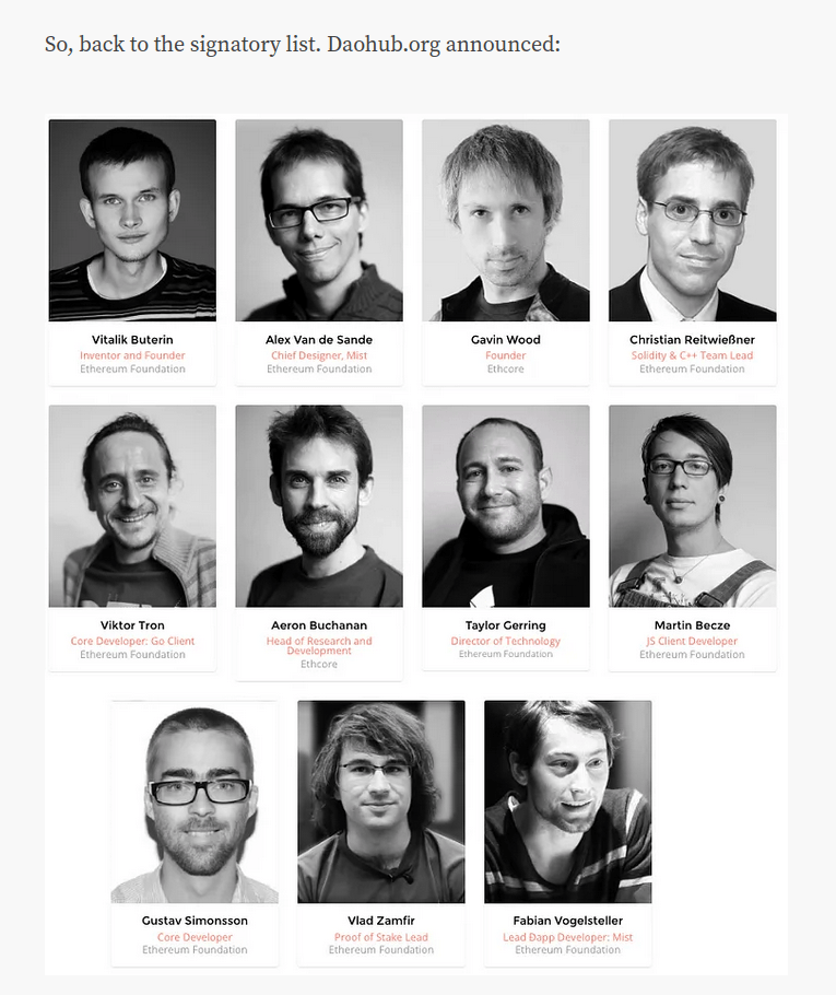 Below are some links and screenshots of articles and web pages related to The DAO, which also has its own Wikipedia page, and to some of the points we talked about in the video. I would recommend Laura Shin’s book at the canonical best information on this whole saga. There is also a detailed timeline on the ETC community website.